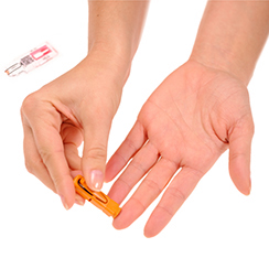 Con il pungidito, molto facile da usare, si pratica una piccola puntura sull’apice del polpastrello del dito prescelto. Per facilitare la formazione della goccia di sangue massaggiare due tre vole il palmo dalla base fino al sito della puntura e esercitare una leggera compressione, con il pollice, alla base del polpastrello dove abbiamo eseguito la puntura. Avvicinare la punta del test alla goccia di sangue per caricarla nell’apposito canale che deve risultare completamente pieno. Quando il canale è pieno di sangue, il test deve essere posizionato su un piano orizzontale e dopo 10 minuti è possibile leggere il risultato. L’interpretazione del risultato è molto semplice .
